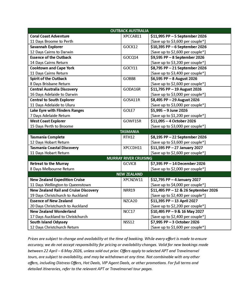 Discover iconic landscapes, luxury guided tours, and unforgettable experiences across Australia and New Zealand — now available with exclusive seasonal savings.