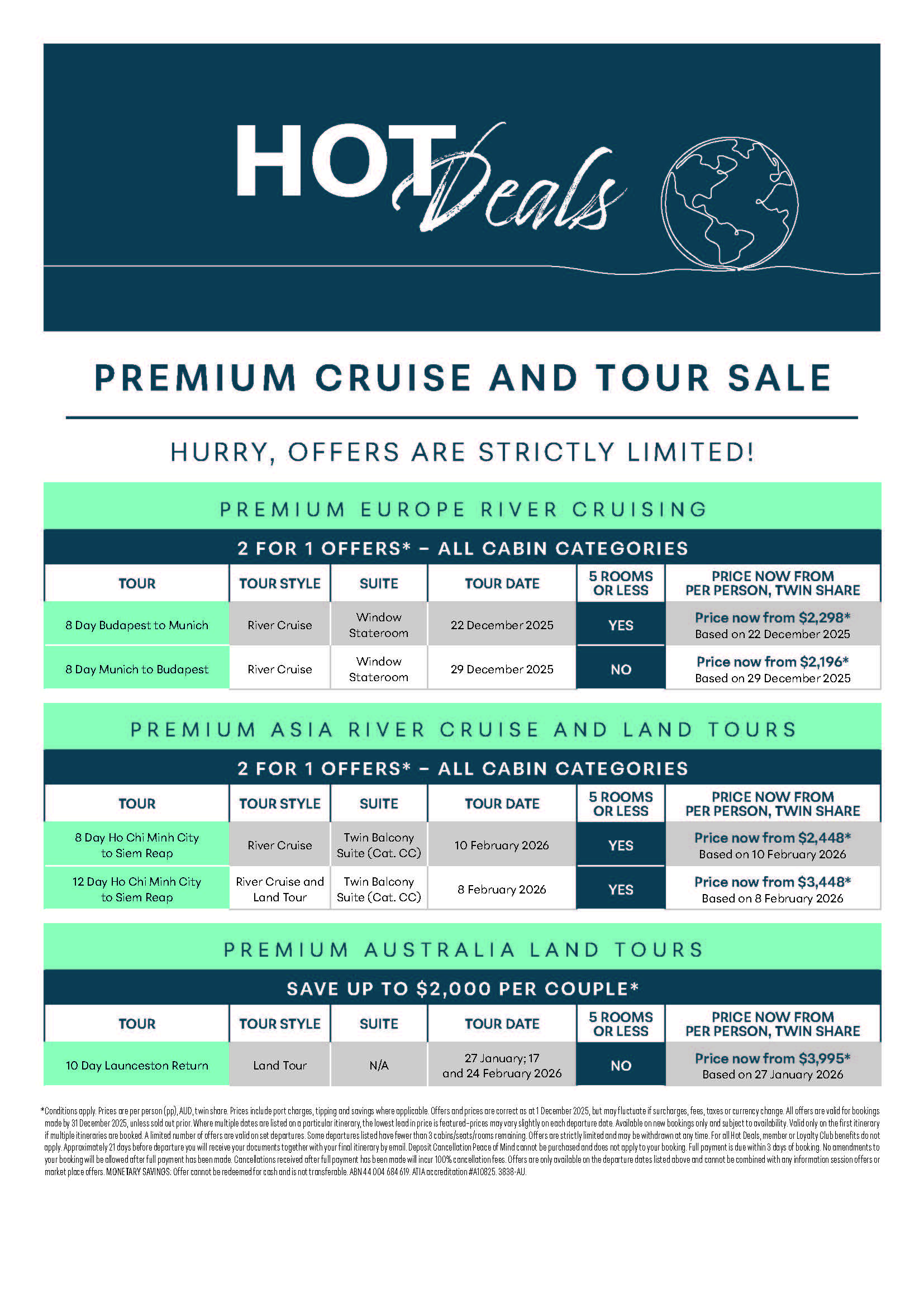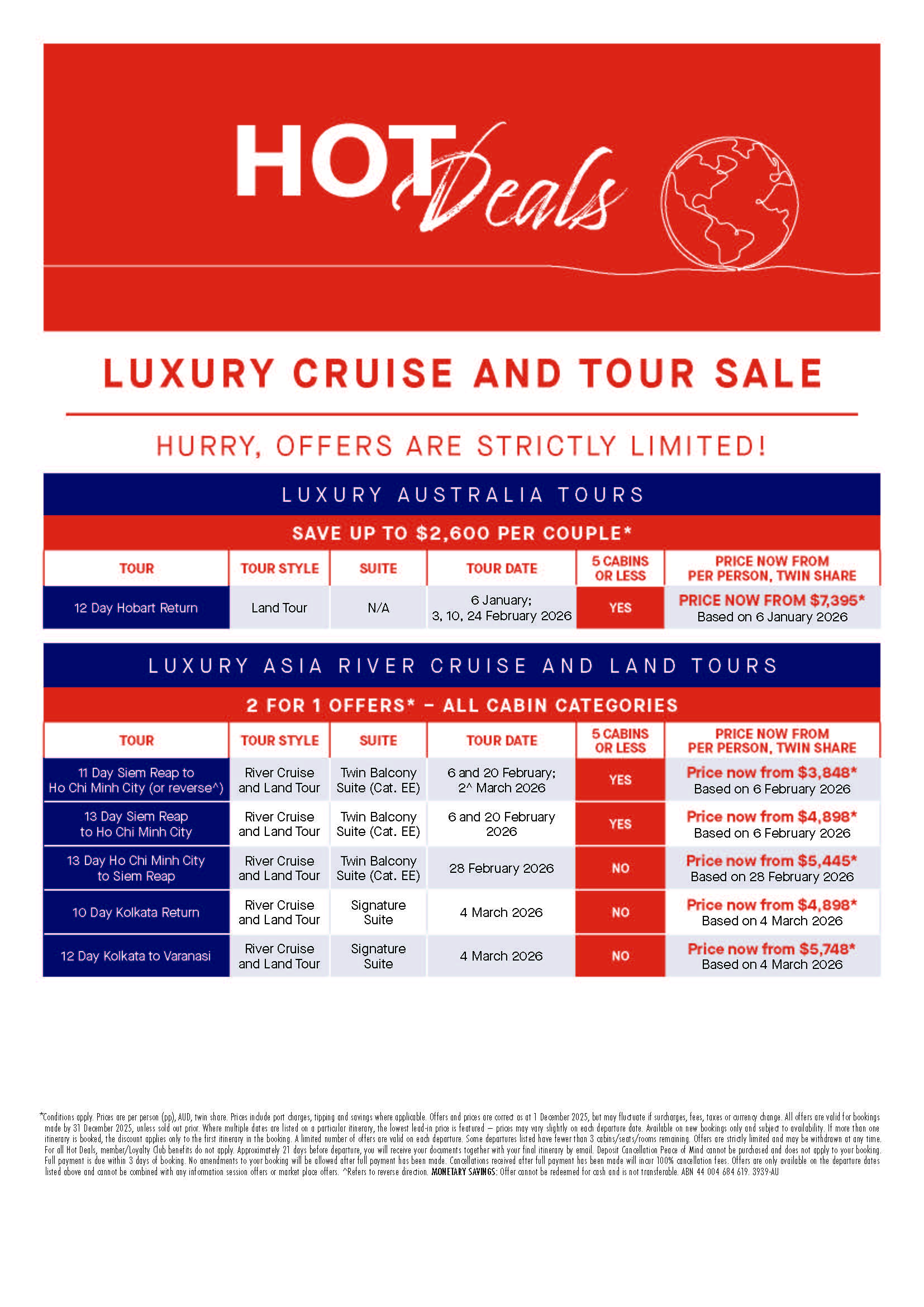 Conditions apply. Prices are per person (pp), AUD, twin share. Prices include port charges, tipping and savings where applicable. Offers and prices are correct as at 1 December 2025, but may fluctuate if surcharges, fees, taxes or currency change. All offers are valid for bookings made by 31 December 2025, unless sold out prior. Where multiple dates are listed on a particular itinerary, the lowest lead in price is featured–prices may vary slightly on each departure date. Available on new bookings only and subject to availability. Valid only on the first itinerary if multiple itineraries are booked. A limited number of offers are valid on set departures. Some departures listed have fewer than 3 cabins/seats/rooms remaining. Offers are strictly limited and may be withdrawn at any time. For all Hot Deals, member/Loyalty Club benefits do not apply. Approximately 21 days before departure you will receive your documents together with your final itinerary by email. Deposit Cancellation Peace of Mind cannot be purchased and does not apply to your booking. Full payment is due within 3 days of booking. No amendments to your booking will be allowed after full payment has been made. Cancellations received after full payment has been made will incur 100% cancellation fees. Offers are only available on the departure dates listed above and cannot be combined with any information session offers or market place offers. ^Refers to reverse direction. MONETARY SAVINGS: Offer cannot be redeemed for cash and is not transferable.
