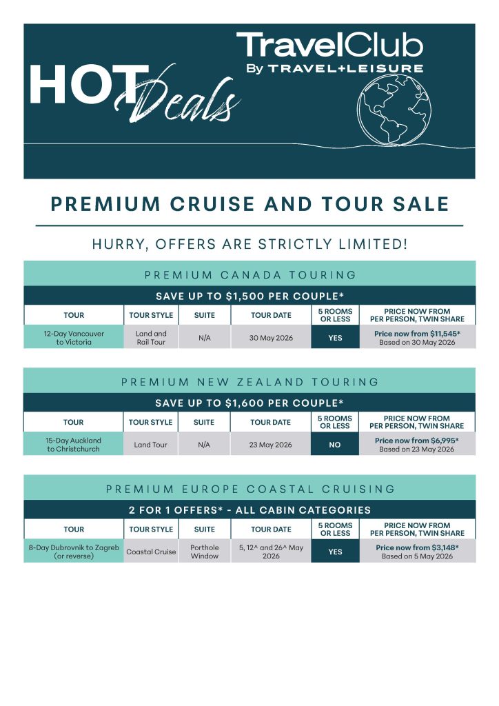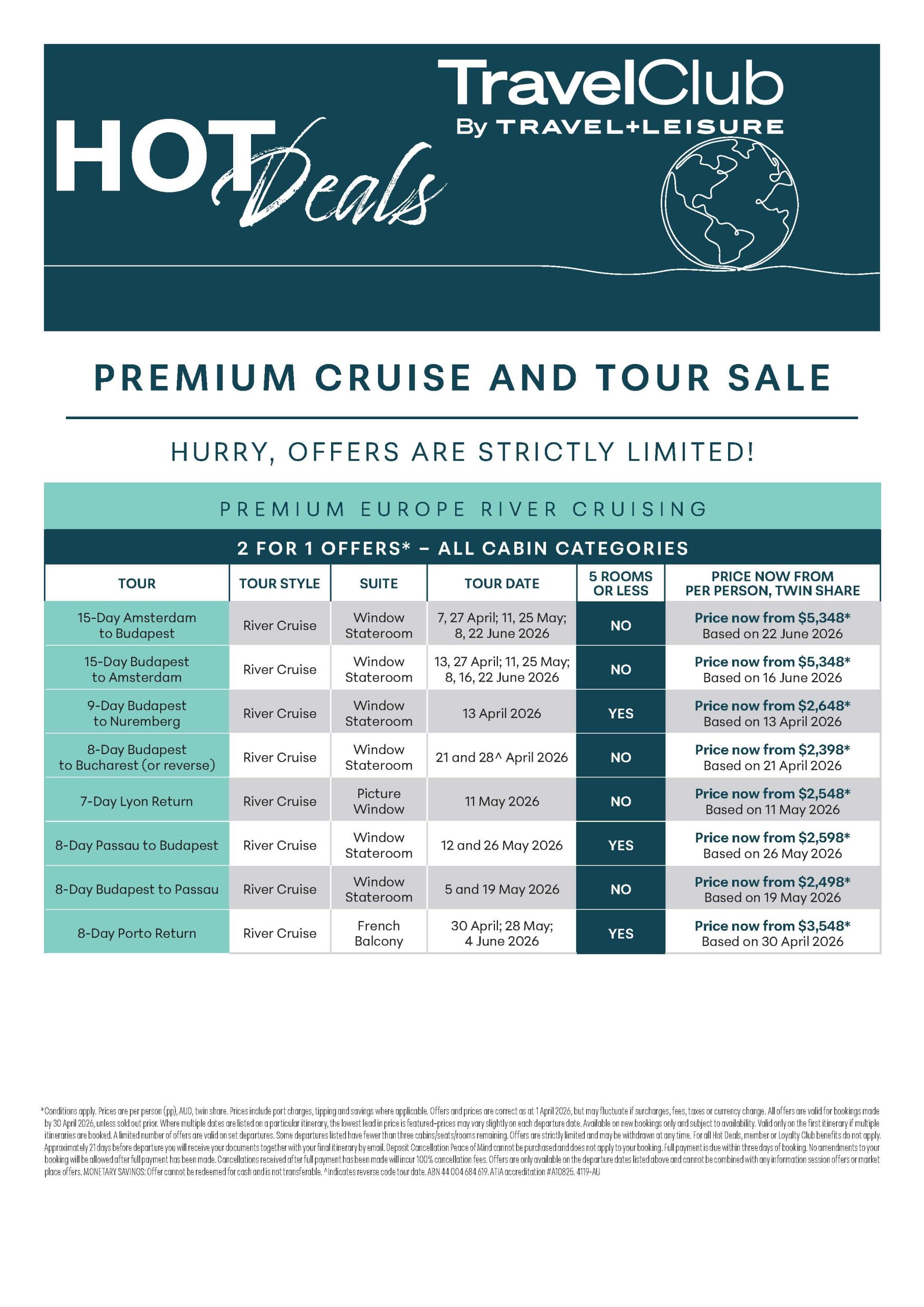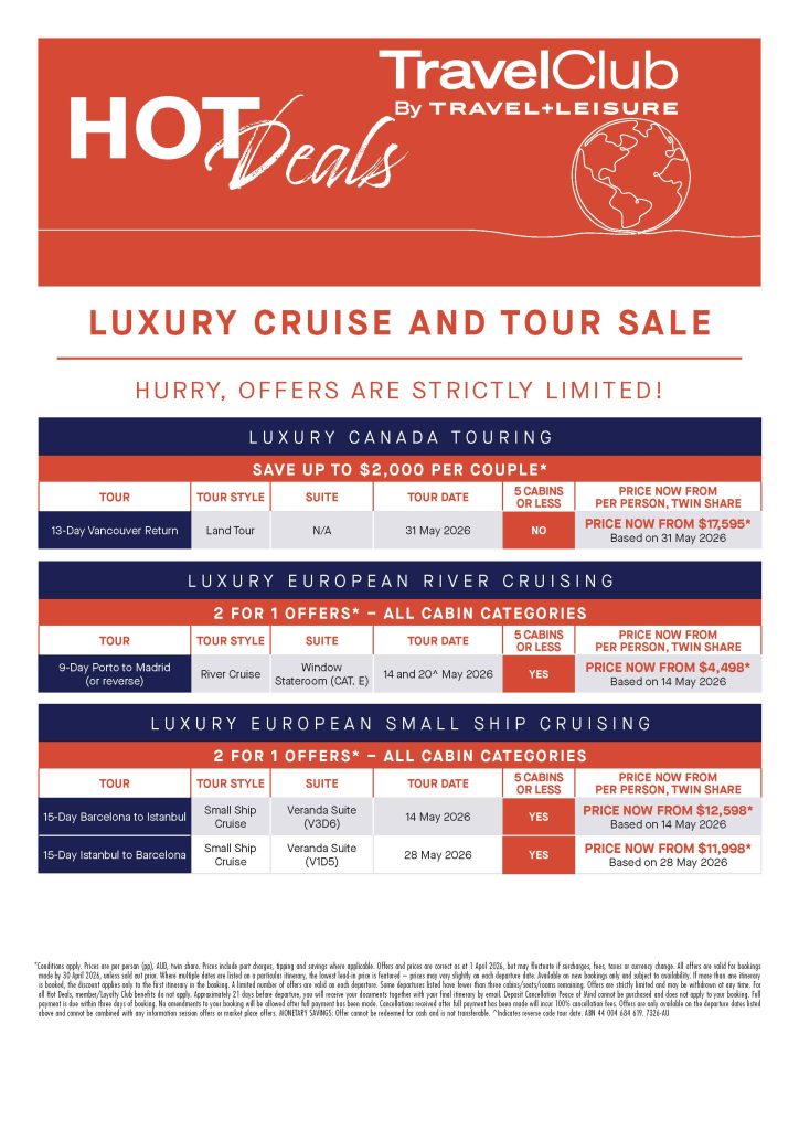 Conditions apply.Conditions apply. Prices are per person (pp), AUD, twin share. Prices include port charges, tipping and savings where applicable. Offers and prices are correct as at 1 April 2026, but may fluctuate if surcharges, fees, taxes or currency change. All offers are valid for bookings made by 30 April 2026, unless sold out prior. Where multiple dates are listed on a particular itinerary, the lowest lead in price is featured–prices may vary slightly on each departure date. Available on new bookings only and subject to availability. Valid only on the first itinerary if multiple itineraries are booked. A limited number of offers are valid on set departures. Some departures listed have fewer than three cabins/seats/rooms remaining. Offers are strictly limited and may be withdrawn at any time. Approximately 21 days before departure you will receive your documents together with your final itinerary by email. Deposit Cancellation Peace of Mind cannot be purchased and does not apply to your booking. Full payment is due within three days of booking. No amendments to your booking will be allowed after full payment has been made. Cancellations received after full payment has been made will incur 100% cancellation fees. Offers are only available on the departure dates listed above and cannot be combined with any information session offers or market