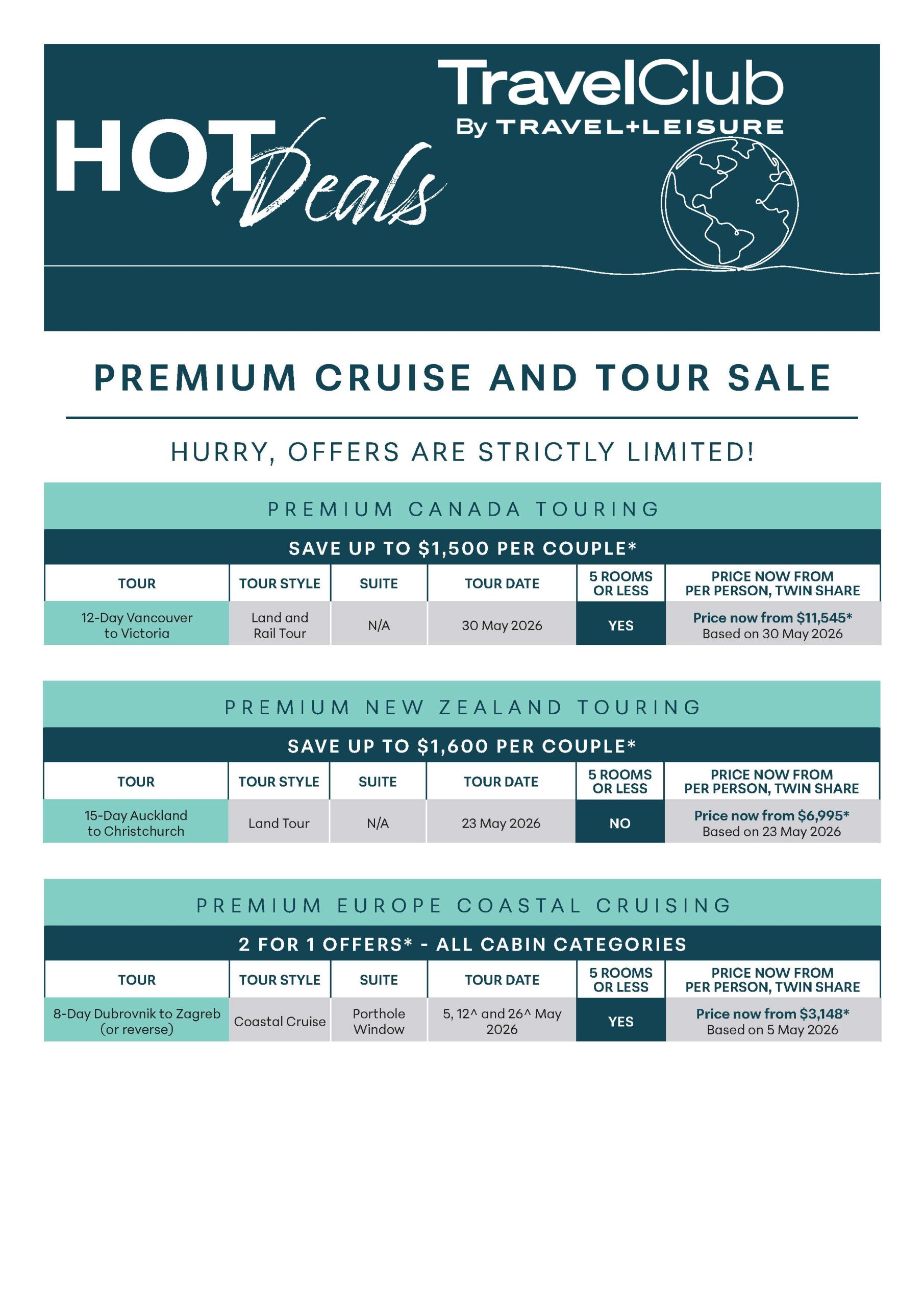 These deals apply only to the tours and cruises mentioned.