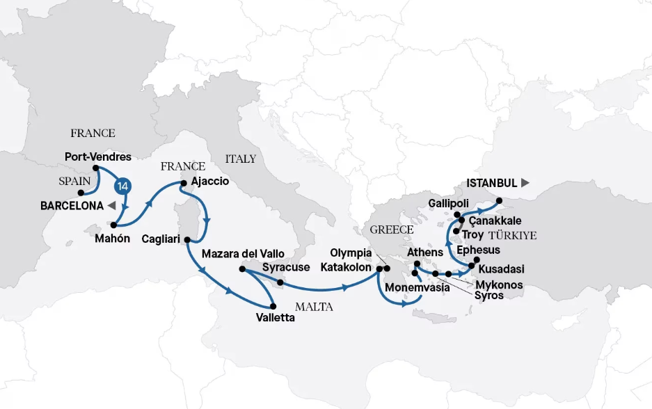 Explore Mediterranean wonders on a 14-night ultra-luxury cruise from Istanbul to Barcelona aboard the Seabourn Venture. Highlights include visiting the Gallipoli Peninsula, the ancient city of Ephesus, the Acropolis of Athens, Sicily, Malta, Corsica and Menorca. Discover breathtaking islands, iconic landmarks, rich history and local cuisine.