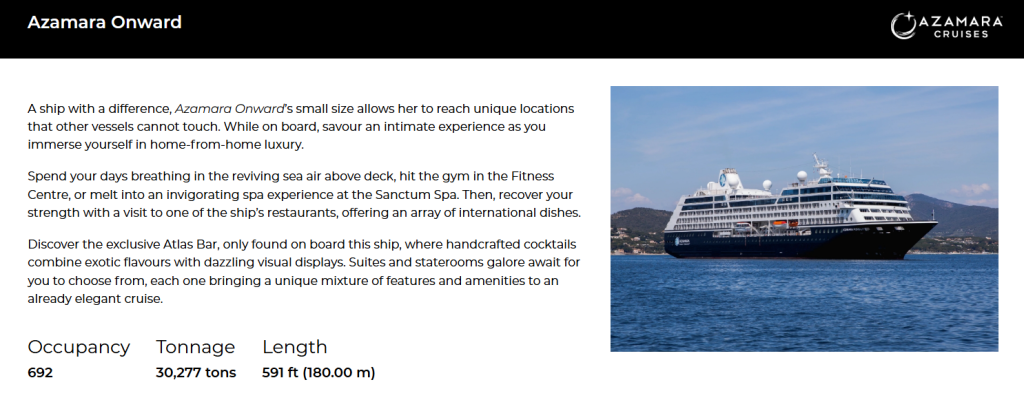 Today, you’ll start your journey on board Azamara Onward, a cruise ship perfectly designed to transport you to hidden gems and storied destinations. While on board, savour an intimate experience as you immerse yourself in comfort.