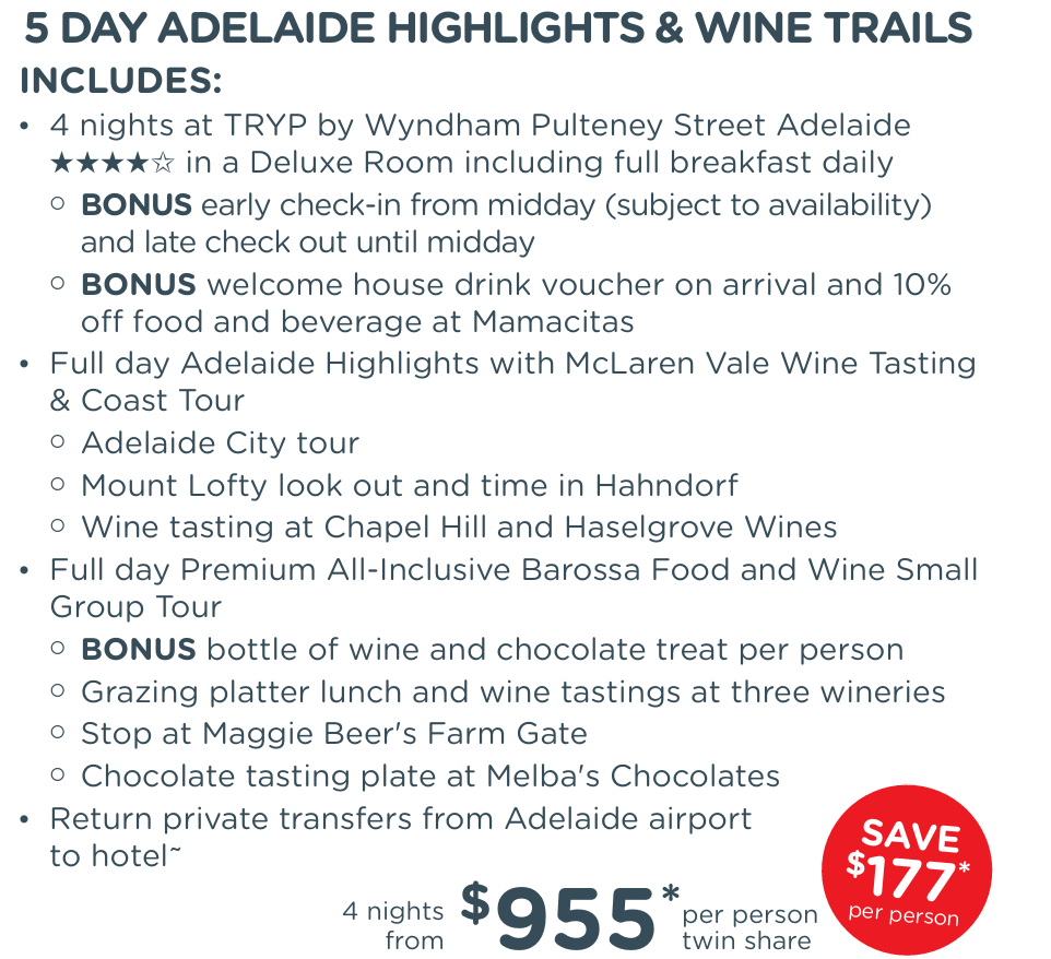 | 5 Day Adelaide Highlights & Wine Trails | AU$955* |