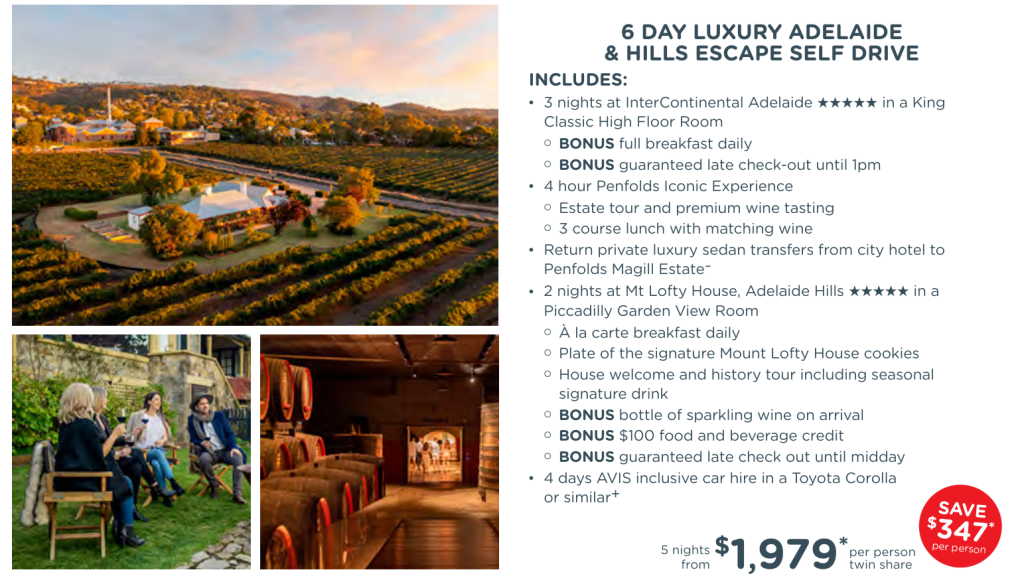| 6 Day Luxury Adelaide & Hills Escape Self Drive | AU$1,979* |