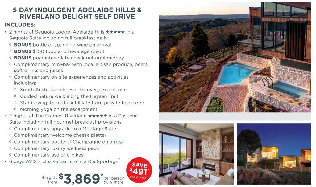 | 5 Day Indulgent Adelaide Hills & Rivereland Delight Escape Self Drive | AU$3,869* |
