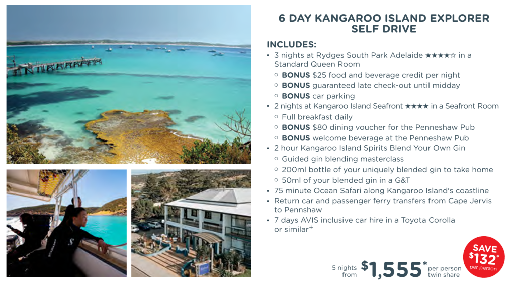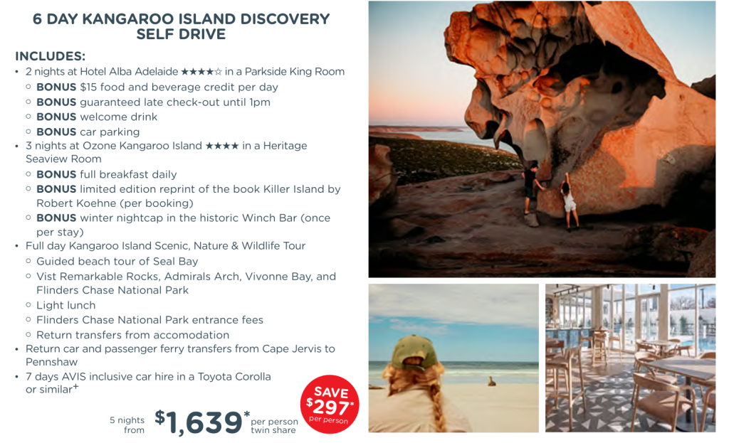 Kangaroo Island Indulgence: 1 May – 31 Aug 26. Add on an extra $15* per person for travel 1-30 Sep 26, an extra $930* per person for travel 1-31 Oct 26 or an extra $1042* per person for travel 1-25 Nov, 30 Nov – 15 Dec 26, 5-31 Jan 27. Travel from 1 Feb – 31 Mar 27 is also available. +Offer is subject to vehicle availability. Minimum renter age is 21 years. Rental is inclusive of unlimited kilometres, Loss Damage Waiver, zero excess and one way rental fee. Rental based on pick up and drop off at Adelaide Airport. Prices correct as at 12 Mar 26 but may be adjusted if surcharges, fees, taxes, or currency exchange rates are affected. All savings and bonus nights (if applicable) are included in the advertised price. Offers may be withdrawn without notice and are not combinable with any other offers unless stated.