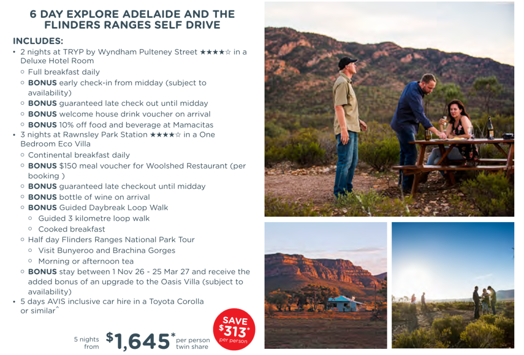| 6 Day Explore Adelaide & the Flinders Ranges Self Drive | AU$1,645* |