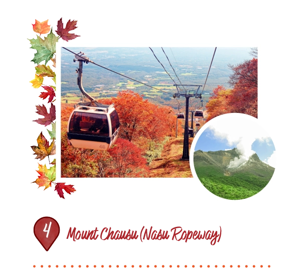 The Nasu Ropeway offers easy access to Mount Chausu (1,915 m), the highest and only active volcano in the Nasu mountain range. A four-minute aerial ride takes visitors to the 9th station, where panoramic views of the Kanto Plain and volcanic smoke are visible. From the top station, it is a roughly 40 to 50-minute hike to the summit. The scenery changes beautifully with the seasons, from spring azaleas to stunning autumn foliage.