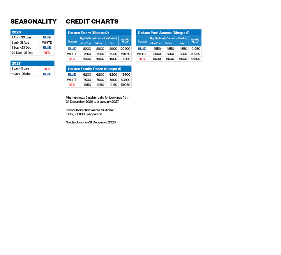 This is an Associate Resort. Associate Resorts is a Developer benefit and at its sole discretion, has, from time to time, made available various Associate Resorts to Premier owners who are in good standing. Access is for a limited duration, subject to additional restrictions and may be added, removed or modified by the Developer without notice. Credits used towards this benefit must have a minimum of six months (180 days) validity to be accepted. Housekeeping token/s or a fee must be tendered when utilising this benefit. Complimentary housekeeping cannot be used in conjunction with this benefit. The booking window to make a reservation at an Associate Resort may vary by location or Lifestyle tier.