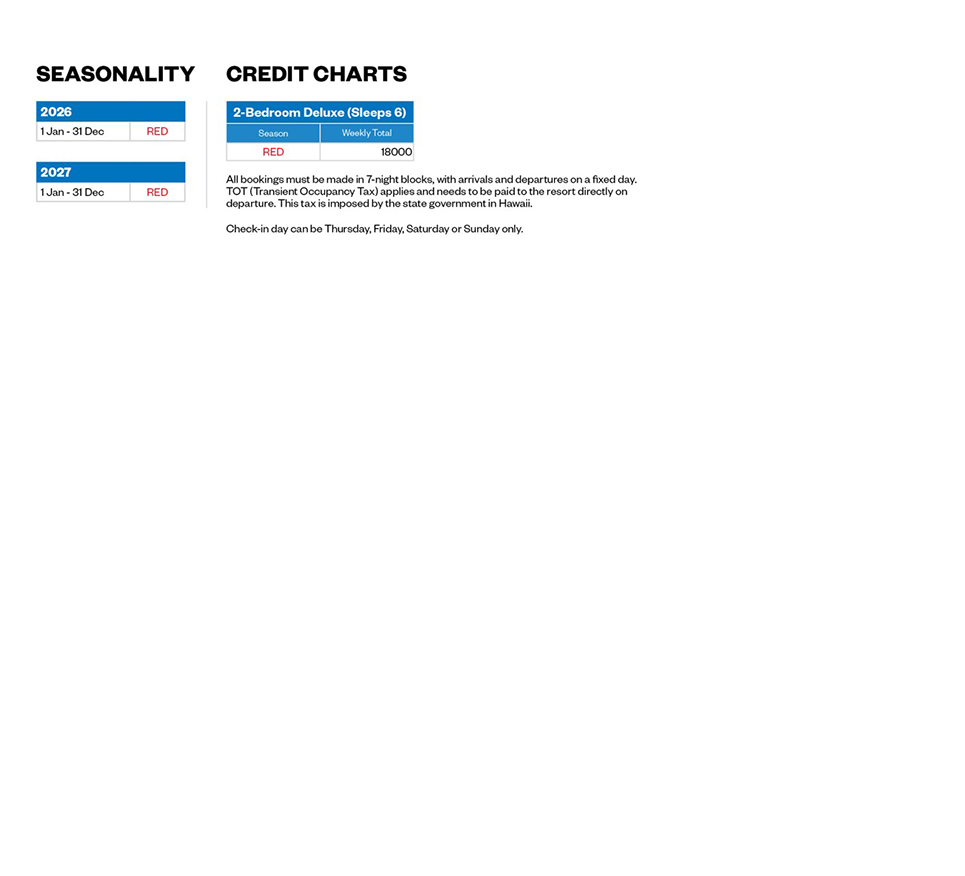 - TOT (Transient Occupancy Tax) of approximately $6 to $12 USD per night (2018 rates), depending on the apartment type, needs to be paid to the resort directly on departure. This tax is imposed by the state government in Hawaii, not dissimilar to the STT in place at Fiji.
