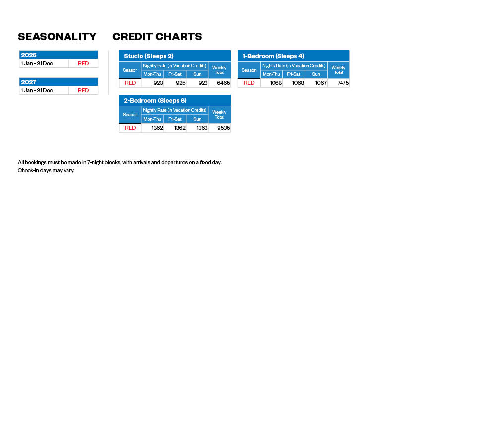 BOOKINGS: All bookings must be made in 7-night blocks, with arrivals and departures on Friday and Saturday only. Multiple reservations can be made by each Owner to build a stay of multiples of 7 nights, however a housekeeping fee applies to each 7-night booking and a room move may be required.
