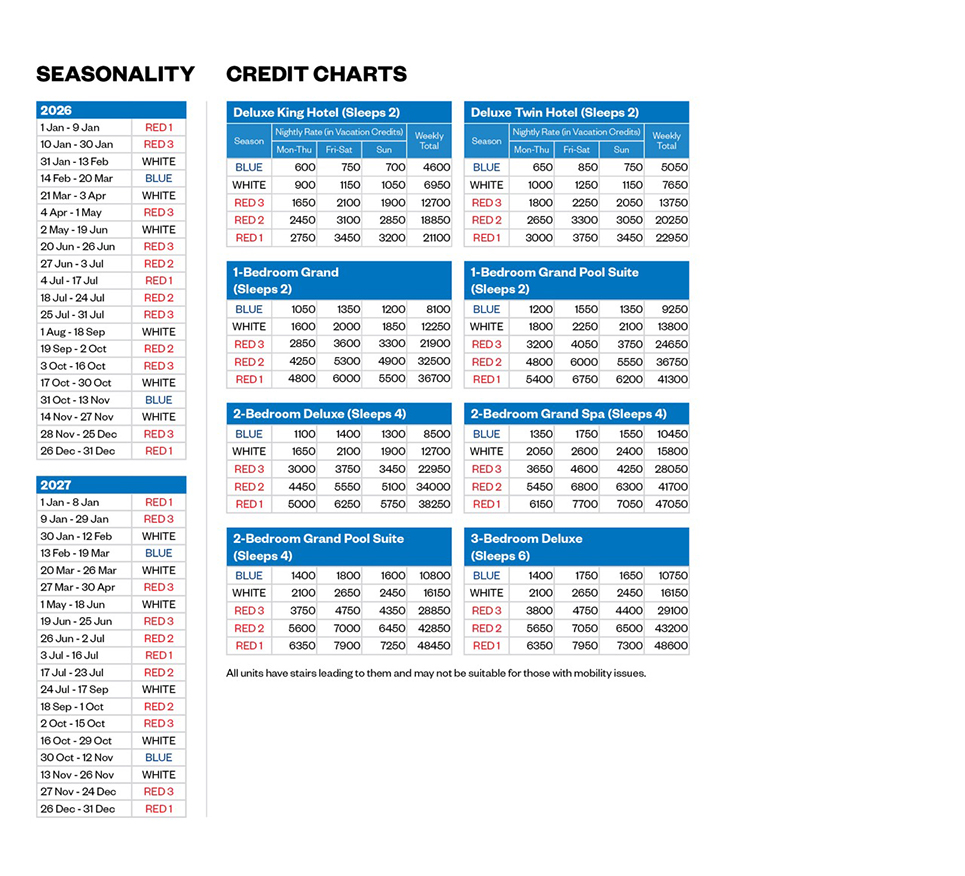 Accessibility: The property is situated on the side of a hill; walking up/downhill and up/downstairs will be required and may not be suitable for guests with mobility issues. Two elevators service the property; however, elevator access is unavailable in some parts of the resort, including access to two pools, spa, fitness centre) and kids-zone, which are only accessible via stairs. All units have stairs leading to them: 1 Bed Grand, 1 Bedroom Grand Pool Suite, Dlx Hotel Queen & 3 Bed Dlx units are on first floors (upstairs), Dlx Hotel Twin and 2 Bedroom Grand Pool Suites are on ground floor, 2 Bed Dlx are on ground & first floor (ground floor can be requested but not guaranteed). All units have stairs leading to them and may not be suitable for those with mobility issues.